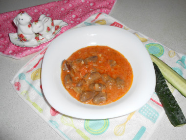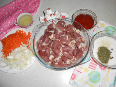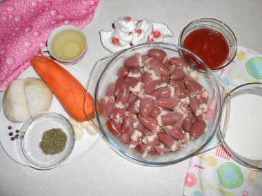 Тщательно промойте желудки и сердечки. Удалите жир, пленку. Крупные желудки можете разрезать пополам.