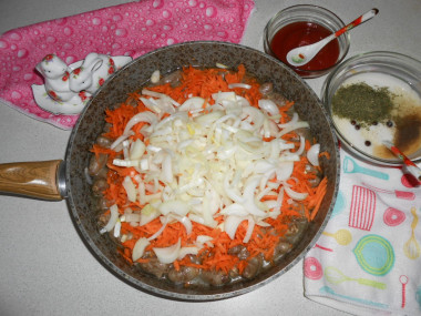 В сковороду к желудкам и сердечкам добавьте лук и морковь. Залейте водой и тушите всё вместе 10-15 минут.