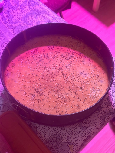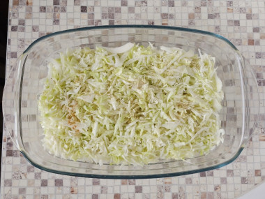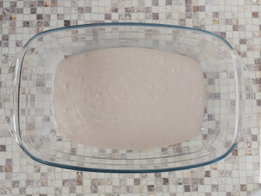 Форму для запекания (у меня размер формы 22 х 18 см) смажьте растительным маслом. Вылейте половину теста. Поставьте форму в разогретую до 200℃ духовку примерно на 7 минут. Так тесто схватится и начинка удержится на поверхности, не проваливаясь на дно. Информацию о формах для выпечки духовок вы найдете в конце рецепта под шагами.