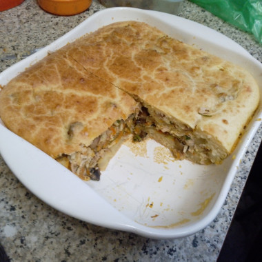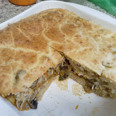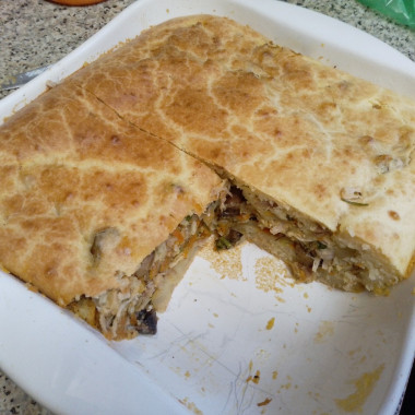 Получился вкусный воздушный пирог. Правда начинка у меня была с курицей, грибами, морковью, луком и зеленью. Большое Вам спасибо за такой прекрасный рецепт. Тесто готовится не сложно и быстро. Супруг даже перепутал тесто с картофелем, думая что это картофельная запеканка. Очень нежное тесто получается.
