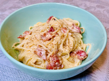 Часто готовлю карбонару, поэтому обратила внимание на рецепт спагетти с беконом и сливками. Сливки придают сливочность и нежность. Паста получилась настолько вкусной, что нам хватило на 3 порции, а не на 7. Готовиться все очень быстро.