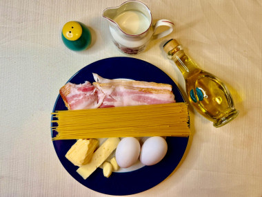 Как сделать спагетти карбонара с беконом и сыром в сливочном соусе на сковороде? Подготовьте необходимые продукты. Оливковое масло можно заменить растительным без запаха.