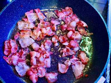 На сковороде с добавлением оливкового масла обжарьте бекон на умеренном огне в течение пары минут. Советы по выбору сковороды для приготовления можно прочитать по ссылке в конце рецепта.
