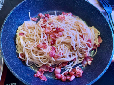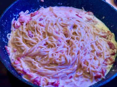 Самое долгое это отварить макароны. Поэтому сперва поставила воду на огонь, а затем приступила к натиранию сыра и обжариванию бекона. Масло не пригодилось, так как от нагревания из бекона выделяется очень много жира. Жарила бекон до хрустящей корочки. Для образования корочки не выкладывала все сразу, а порционно. Распределяла часть по всей сковороде, что б кусочки бекона были разделены, он зажаривался секунд 5-10, отодвигала его к краю сковороды и далее выкладывала новые партии. Так он не слипается друг с другом и аппетитно зажаривается. Когда бекон был почти готов, то добавила рубленый чеснок. Затем спагетти. Выключила нагрев и влила соус из желтков, перца, сливок и сыра. Быстро все мешала, чтобы сыр не успел расплавится в большой комок. Долила еще воды около 150 мл, что б паста была скользкой, в большом количестве соуса. При подаче добавила черный перец.