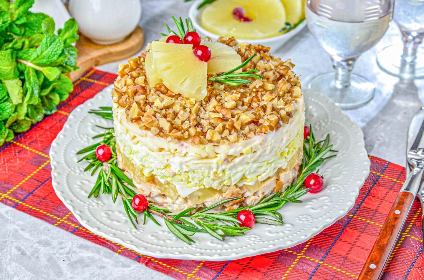 Сочетание сладких ананасов и копченого сыра — яркий пример игры контрастов, которую так любят современные шеф-повара. Интересно, что консервированные ананасы в таком салате часто предпочтительнее свежих, так как они более сочные и имеют стабильную сладость. А грецкие орехи не только добавляют хруста, но и богаты омега-3, что делает это вкусное блюдо чуть полезнее.