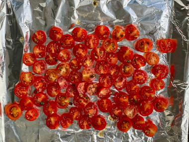 Решетку или противень застелите фольгой (блестящей стороной вверх). Разложить половинки помидоров срезом вверх, посолите, посыпьте сухими итальянскими травами (или другими травами какие нравятся) и побрызгайте сверху заправкой. Все тонкости использования фольги вы узнаете прочитав статью под шагами.