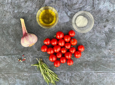 Черри у меня мелкие попались, разрезала их пополам, вместо пущенных трав использовала свежий розмарин.