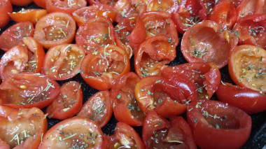 Запекайте противень с помидорами в разогретой до 130-140 С духовке примерно 3-4 часа (в зависимости от размера помидоров), а еще лучше если есть время, то можно при низкой температуре 100 С – 6 часов. Мне надо было быстро сделать их быстро. Учитывайте, что время указано приблизительно будет зависеть от особенностей работы вашей печи. О духовках читайте отдельную статью в конце рецепта.