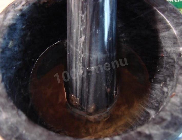 Как сделать заправку? Чеснок очистите от шелухи. Количество чеснока можете менять в зависимости от ваших вкусовых предпочтений. В ступке перетрите горошины перцев, зубчик чеснока, сахар и все это залейте оливковым маслом. Заправка готова.