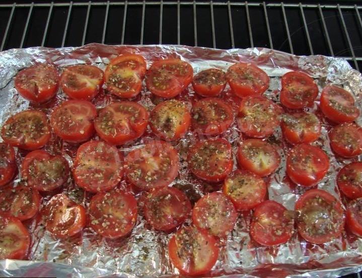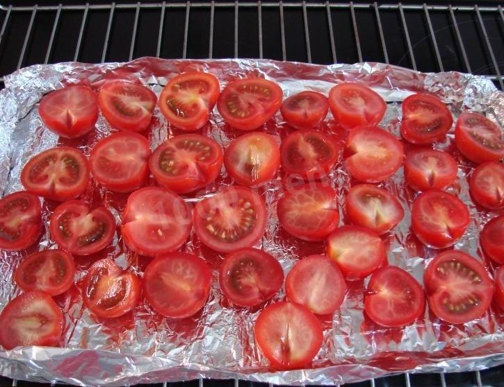 Далее слегка отошла от рецепта и не сверху побрызгала маринадом, а окунула томаты в маринад и потом выложила на фольгу.