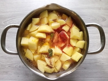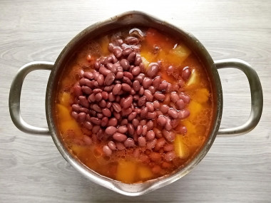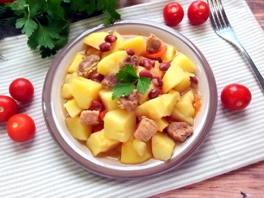 Я готовила в кастрюле. Сначала обжарила кусочки свинины, затем добавила лук и морковь. Морковь нарезала крупно. Томатной пасты много не стала добавлять, она у меня кисловатая. Из специй взяла паприку, куркуму, лавровый лист и молотый душистый перец. Воды влила столько, чтобы получилось много бульона. Тушила под приоткрытой крышкой до готовности картошки. Затем добавила промытую консервированную фасоль и потушила еще 5 минут.