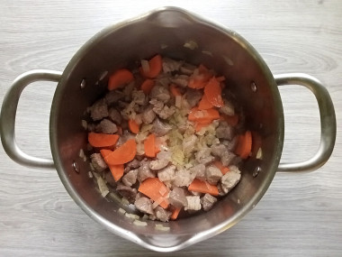 В казан или в кастрюлю с толстым дном влейте растительное рафинированное масло и нагрейте его. Отправьте мясо в казан. Помешивая, обжарьте его до золотистого цвета. Добавьте лук и морковку. Перемешайте и готовьте ещё 5 минут. С выбором масла для жарки поможет стать по ссылке в конце рецепта.