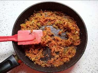 На сковороде с добавлением растительного масла обжарьте лук с морковью, периодически помешивая, до полуготовности.
