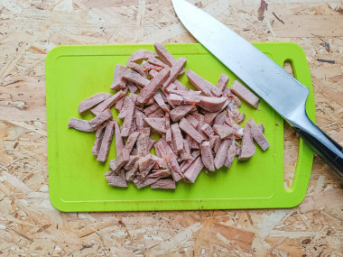 Готовый язык поместите на несколько секунд под струю холодной воды. Затем очистите от кожицы. Язык полностью охладите и нарежьте соломкой. Готовьте салаты только из полностью охлажденных продуктов. Приготовленный из теплых, салат может быстро испортиться.