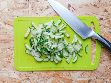 Огурцы вымойте и обсушите. Нарежьте соломкой. Кожицу, если она не грубая, не повреждена и не горькая, срезать необязательно.
