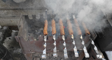 Снимите люля-кебаб из свинины с мангала и сразу же подавайте к столу.