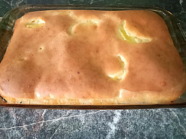 Поместите форму для запекания на среднюю полку духовки. Запекайте пирог 30-40 минут при 180 градусах. Проверить готовность пирога можно зубочисткой, проткнув пирог в середине. Если на зубочистке останутся комочки – то выпекайте ещё немного времени. Приятного аппетита!