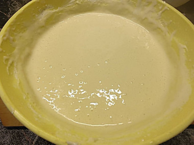 В полученную массу просейте муку и замесите тесто. Количество муки зависит от густоты кефира и майонеза, рецепт предусматривает, что тесто в результате должно получится по консистенции как на оладьи.