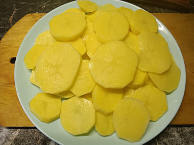 Картофельные клубни тонко нашинкуйте кружочками. Для удобства можно воспользоваться специальной теркой-шинковкой, чтобы ломтики получились все одинаковой толщины.