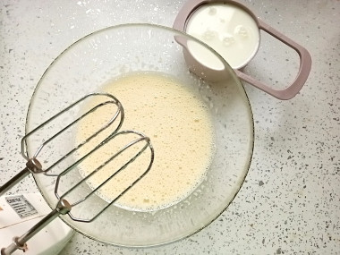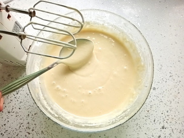 Затем в три приема влейте в яичную массу молоко. После каждой порции молока всыпайте частями муку, смешанную с разрыхлителем, просеивая ее через сито. Вместо разрыхлителя вы можете взять соду, гашеную лимонным соком. Аккуратно, чтобы не повредить взбитую массу, вмешивайте молоко и муку в тесто. Муки может уйти как больше, так и меньше указанного количества, смотрите по консистенции. Тесто должно стать однородным и текучим, как густой йогурт.