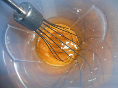 Затем начните добавлять растительное масло. Вливайте его небольшими порциями, буквально по ложечке. И очень хорошо взбивайте массу венчиком после каждого добавления. Наберитесь терпения, взбивать нужно долго. И не лейте много масла сразу, майонез не взобьется.