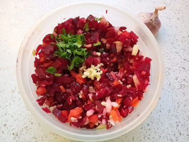Чеснок пропустите через пресс и отправьте к остальным ингредиентам.