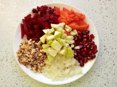 Свеклу и морковь я приготовила на пару, недавно убедилась, что для меня это и наиболее удобный вариант. Да и все соки остаются в овощах. Горечь лука "обезвредила" с помощью кипятка. Хотя лучше бы замариновала в уксусе, так появилась бы приятная кислинка. Делали мы салат совместно с дочкой: она занималась свеклой, морковью и гранатом, а я остальным. Нарезали все быстро, соединили и перемешали. Майонез не стали использовать, заправили оливковым маслом и солью. Салат настаивался несколько часов в холодильнике, после чего стал очень вкусным. Все составляющие обменялись соками и ароматами. Это действительно вкусное сочетание! В следующий раз еще добавлю немного уксуса для кислинки.