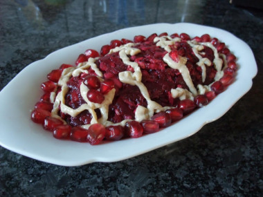 Салат - просто чудо получился, сочный, нежный,пикантный, ну очень вкусный, просто тает во рту. Прилагаю фото. Я его украсила постным майонезом из грецких орехов. Вот правда гранат попался такой сладкий - ну ни капельки кислинки, пришлось немного виноградного уксуса добавить. И еще, каюсь, овощи я не кубиками нарезала, а на крупную терку натерла. Спасибо , Анаит, еще раз за такой хороший рецепт.