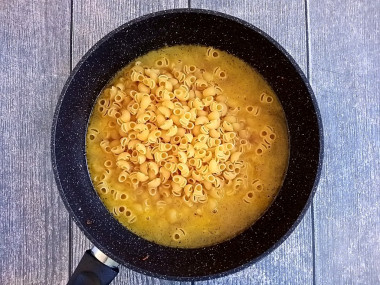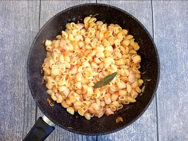 Всыпьте макаронные изделия, перемешайте. Доведите до кипения, накройте крышкой. Убавьте огонь и варите до готовности. Точное время на приготовление макарон всегда указывает производитель. У меня были перья, на упаковке указано время готовки 10-11 минут. Но я сняла сковороду с огня через 8 минут, т.к. мне нравятся макароны в состоянии альденте.
