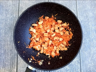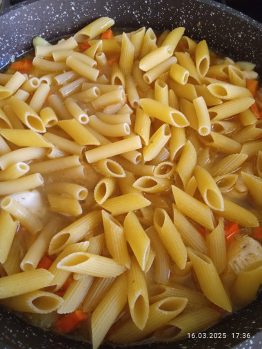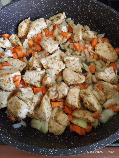 Готовила блюдо в большой сковороде вок, это удобно. Обжарила небольшие кусочки грудки до румяности. Затем добавила лук и минут через 5 морковь. Как только мясо стало мягким, влила горячую воду и засыпала макароны. При помешивании довела до кипения, а дальше тушила на небольшом огне.