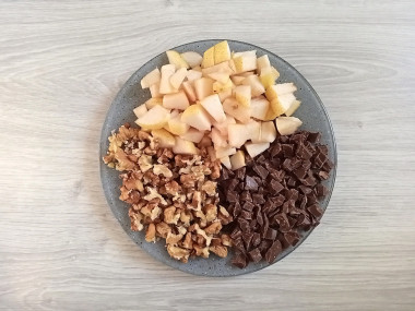 Для начинки взяла темный шоколад с ароматом кофе, порубила его ножом на маленькие кубики. Орехи подсушила на сухой сковороде и тоже порубила ножом. Груша у меня "китайская" сочная с небольшой кислинкой. Ее нарезала небольшими кусочками.