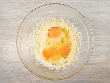 Вбейте в масляную смесь яйца. Обязательно мойте яйца перед использованием, так как даже на кажущейся чистой скорлупе могут находиться вредные бактерии. Лучше добавлять яйца по одному, взбивая после каждого до однородности. Так яйца более равномерно смешаются с общей массой.