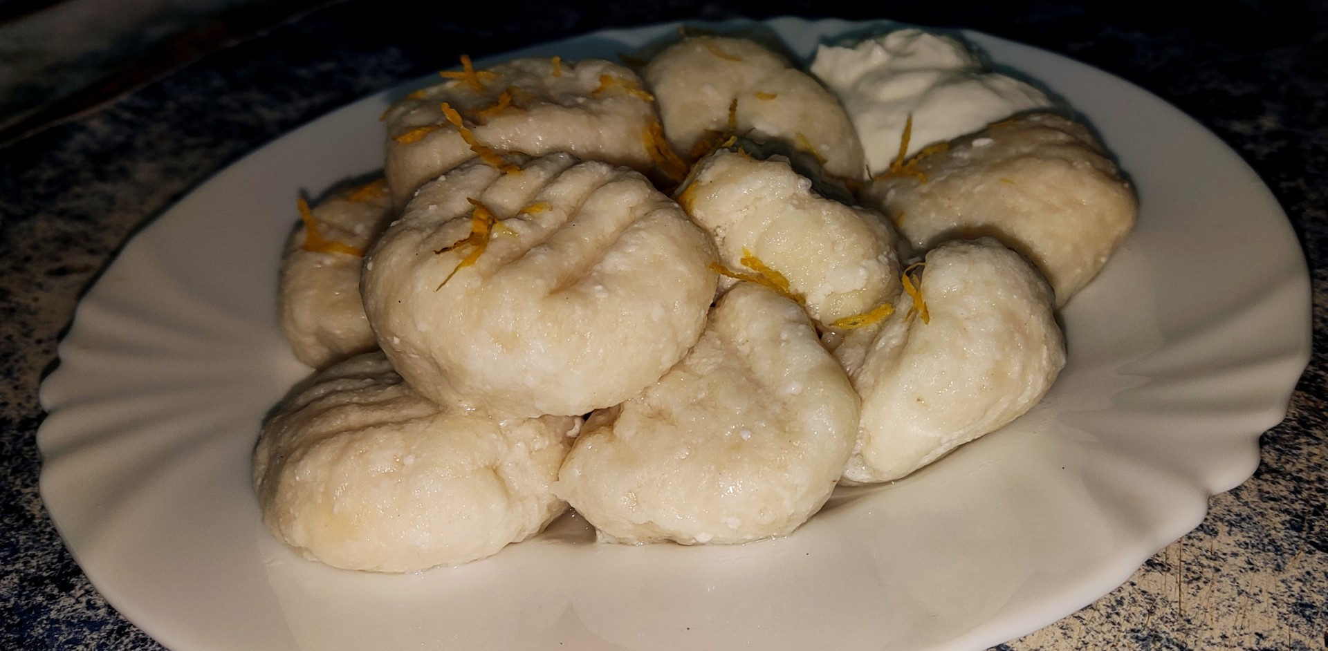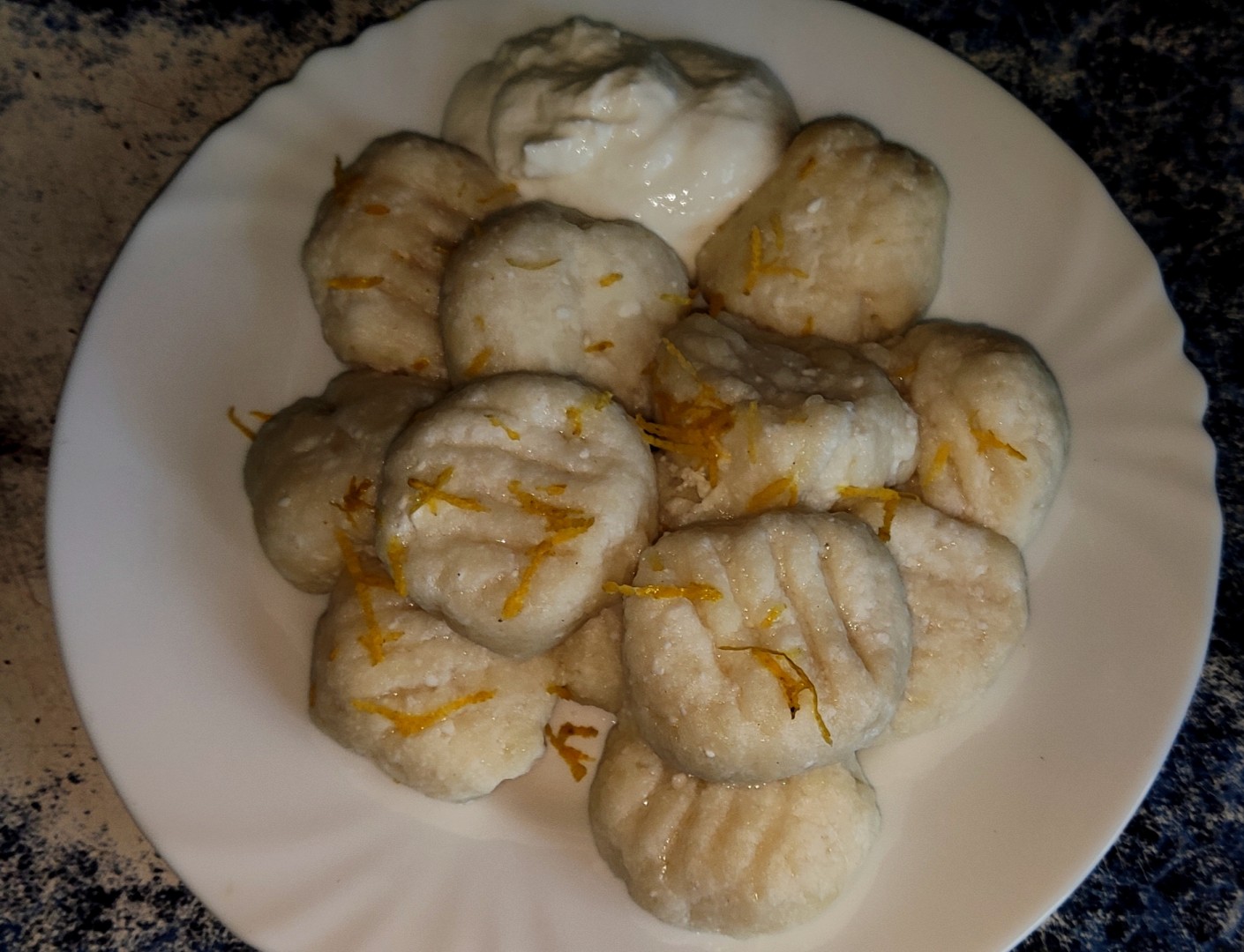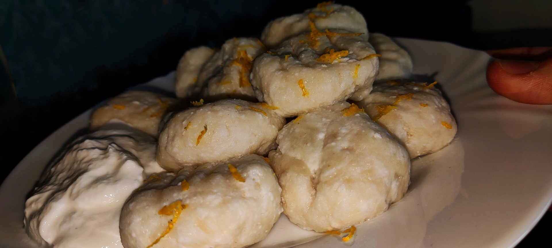теперь расскажу о небольших фишках, которые я добавил, в тесто добавил щепотку ванилина, потом решил по няряднее блюдо сделать и при формовке прижал вилкой каждый кусочек, на фото видно рисунок, ну и я изменил подачу слегка, подал с греческим йогуртом (предварительно смешаным с сиропом), и сверху цедра лимона, зашла очень хорошо, всем рекомендую рецепт, особенно если вы следите за фигурой