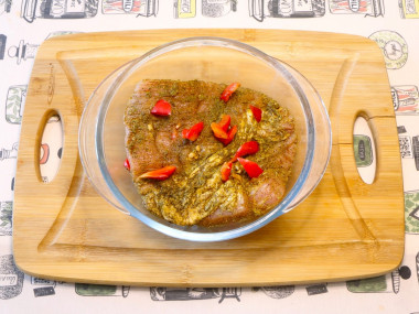 В глубокую форму для запекания выложите мясо. Полейте мясо маринадом. О том, как выбрать форму для запекания, читайте в отдельной статье по ссылке в конце рецепта.