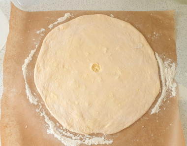 Подошедшее тесто обомните, выложите на присыпанный мукой пергамент и руками или скалкой раскатайте в ровный круг диаметром около 20-25 см. Тесто очень податливое, мягкое, его легко растянуть просто руками.
