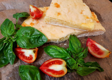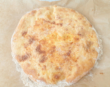 Слегка присыпьте верх мукой и переверните тесто на другую сторону. Руками или скалкой снова осторожно, чтобы тесто не порвалось, расплющите заготовку в ровную круглую лепешку диаметром около 30 см.