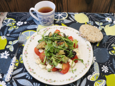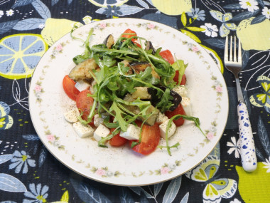 На ланч решил приготовить салат с баклажанами и страчателлой (но в моем случае с сыром фета). Моем овощи и зелень (рукколу и баклажаны обязательно обсушиваем салфетками или чистым кухонным полотенцем), нарезаем баклажаны кусочками среднего размера, обваливаем в крахмале (у меня кукурузный) и пока откладываем, режим на четверти помидоры (если черри мелкие можно пополам). Обжариваем баклажаны на среднем огне до хрустящей корочки, выкладываем на салфетки чтобы впитать лишнее масло. Затем все выкладываем в подходящую посуду, солим, перчим по вкусу, сбрызгиваем оливковым маслом (думаю можно подсолнечным, льняным; кунжутное я бы не стал брать, так как имеет очень выраженный аромат. Аккуратно перемешиваем, подаем к столу теплым. Салат имеет яркий насыщенный вкус баклажанов, дополненный нежным сливочным вкусом сыра и кислинкой помидоров, с легким привкусом рукколы. Приятного аппетита!