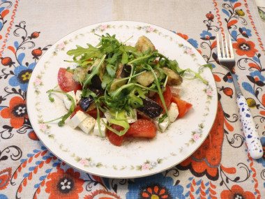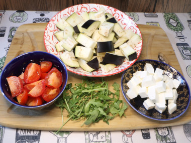 На тарелку выложите рукколу, помидоры черри и обжаренные баклажаны.
