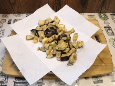 Переложите обжаренные ломтики баклажана на бумажные салфетки, чтобы впитался лишний жир.