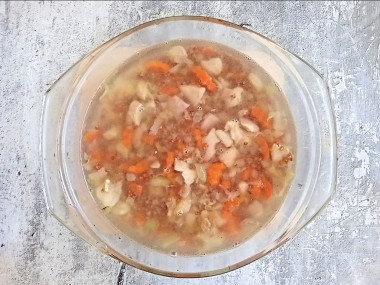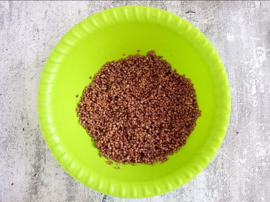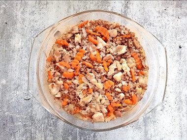 Возьмите подходящую форму для запекания. Выложите в нее обжаренную курицу с луком и морковью. Гречку переберите, убирая мусор и черные зерна. Очень хорошо промойте ее под проточной водой. Выложите крупу к курице, перемешайте. О том, как выбрать форму для запекания, читайте в отдельной статье по ссылке в конце рецепта.