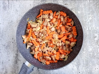 Разогрейте на среднем огне сковороду, влейте на нее растительное масло для жарки. Выложите куски нарезанного филе. Обжарьте их, помешивая, до изменения цвета со всех сторон, 7-10 минут. Выложите к курице лук и морковь. Жарьте все вместе еще пару минут. В конце посолите и добавьте специи по вкусу. О том, как подобрать идеальную сковороду, а также как правильно выбрать растительное масло, читайте в отдельных статьях, ссылки в конце рецепта.