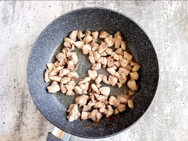 Мясо обмойте и хорошо обсушите бумажными полотенцами, иначе при обжарке оно начнет тушиться. Нарежьте филе крупными кубиками.