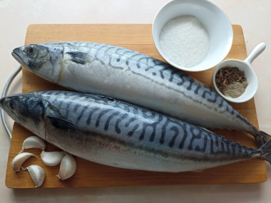 Как сделать мурманское сало из скумбрии с чесноком в домашних условиях? Подготовьте продукты. Рыбу возьмите свежую, она обычно продается замороженной. Перед началом приготовления советую не размораживать скумбрию до конца — тогда ее будет легче разделывать. Количество чеснока регулируйте по своему вкусу, можете уменьшить или увеличить его. Это же касается и специй — берите те, что любите.