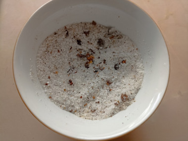 Сразу смешайте в мисочке соль, сахар, молотый черный перец и молотый кориандр (и любые другие специи, какие посчитаете нужными). О том, какие специи подходят для рыбных блюд, можно прочитать в статье под рецептом.