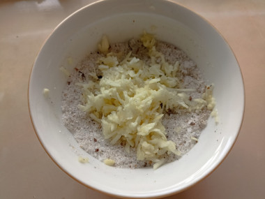 В результате у вас получится четыре филе с двух рыб. Промойте и хорошо обсушите их. Натрите филе смесью соли, сахара и специй. Зубчики чеснока очистите и пропустите через пресс. Размажьте чесночное пюре по рыбе.