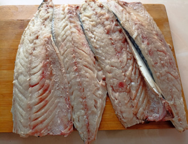 Приготовила мурманское сало из скумбрии. Рыбу разделала на филе, натерла посолочной смесью ( соль, сахар, специи, измельчённый чеснок), филе сложила попарно, плотно завернула в пищевую пленку и на сутки положила в холодильник. Затем переложила в морозилку. Мурманское сало - это потрясающе вкусная закуска из скумбрии! Рекомендую приготовить. Спасибо за рецепт, katushafin!