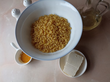 Куркумы у меня не оказалось, я добавила пару щепоток приправы для шашлыка, в её составе есть куркума и паприка. Но паприка преобладает, поэтому мои макароны получились едва заметным оранжевым колером, что тоже не плохо. Масло использовала только растительное.