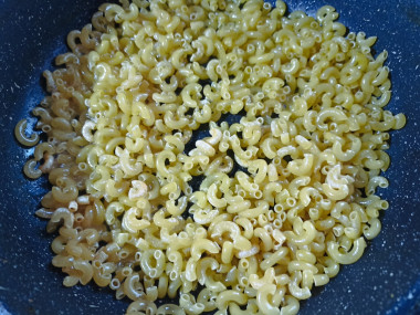Выложите на сковороду макароны, добавьте специи, перемешайте. Специи добавляйте по вкусу. Если хотите получить более острое, пикантное блюдо, немного увеличьте количество специй, но не переусердствуйте.Шаг 4:
