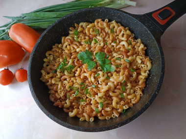 На гарнир приготовила жареные макароны на сковороде без варки. Рожки я очень хорошо обжарила прям до зарумянивания, жареные так жареные)))! Из приправ использовала только куркуму. Рецепт несложный и очень удобный, не требуется откидывать макароны в дуршлаг. Спасибо автору за рецепт!