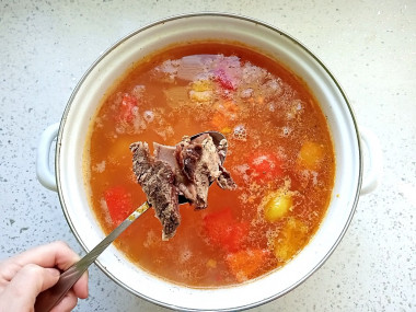 Чечевица у меня тоже красная, мы ее любим. Промыла ее хорошенько от мутной воды и выложила в бульон к картошке. Варится красная чечевица очень быстро! Затем добавила зажарку и лавровый листочек. Из приправ у меня сушеные овощи, паприка, соль и щепотка перца. Срезанное с кости мясо выложила в последнюю очередь, т. к. оно было очень мягкое и в дополнительной варке не нуждалось.
